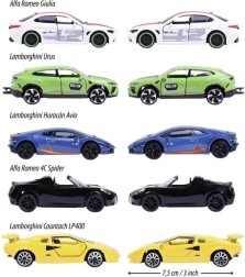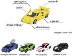 În pachet găsești o selecție de vehicule legendare: ALFA ROMEO 4C Spider, LAMBORGHINI Countach LP 400, LAMBORGHINI Huracán Avio, LAMBORGHINI Urus și ALFA ROMEO Giulia. Datorită părților articulate și suspensiei funcționale, rularea este lină și realistă. Perfect pentru copii de la 3 ani în sus și ca accesoriu stilat pentru colecție.