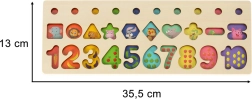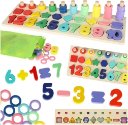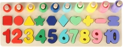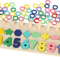 Acest set montessori îmbină bucuria asamblării cu învățarea. Copiii potrivesc formele geometrice din lemn și cifrele în orificiile corecte și, în același timp, înșiră pe țepușe inele colorate al căror număr corespunde cifrei indicate. Datorită bazei din lemn bine organizate, învățarea devine naturală și distractivă.