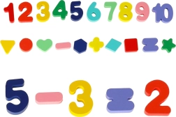 Copiii potrivesc formele colorate și cifrele în pozițiile corecte, exersând astfel discriminarea vizuală, logica și vocabularul (culori, forme, numere).