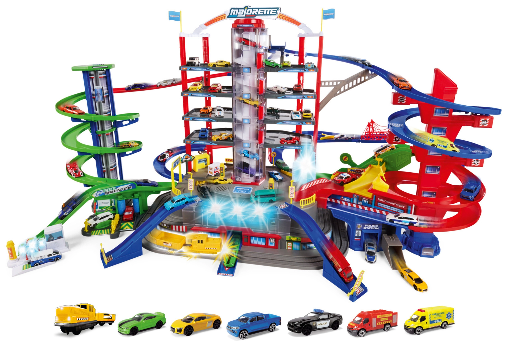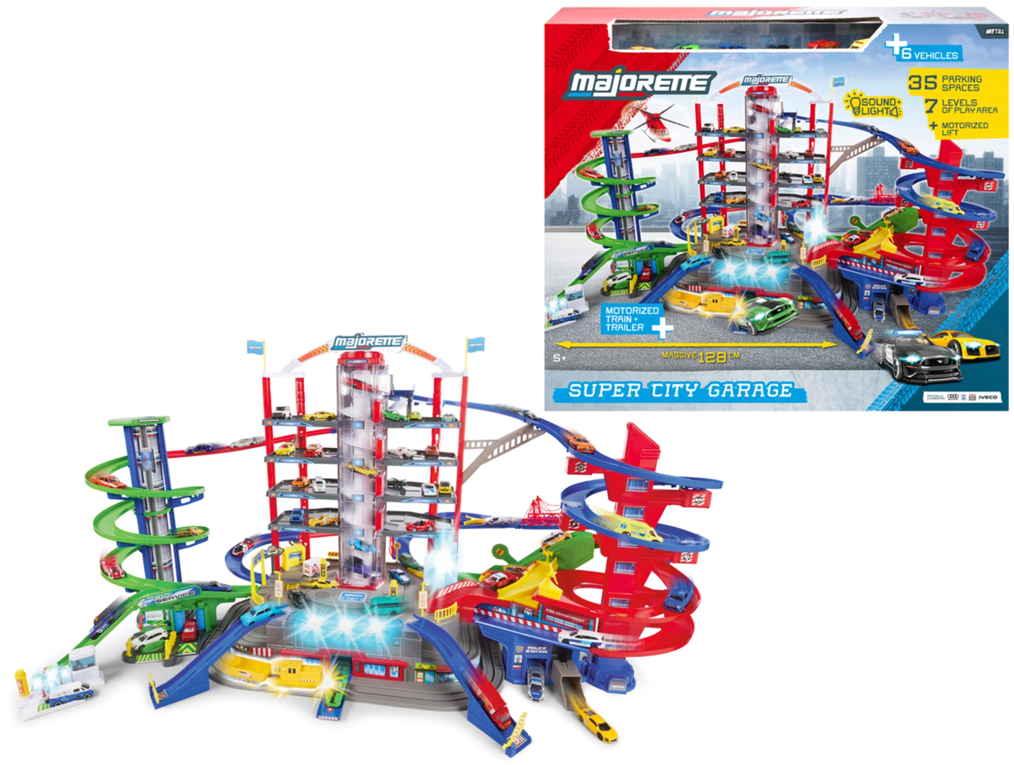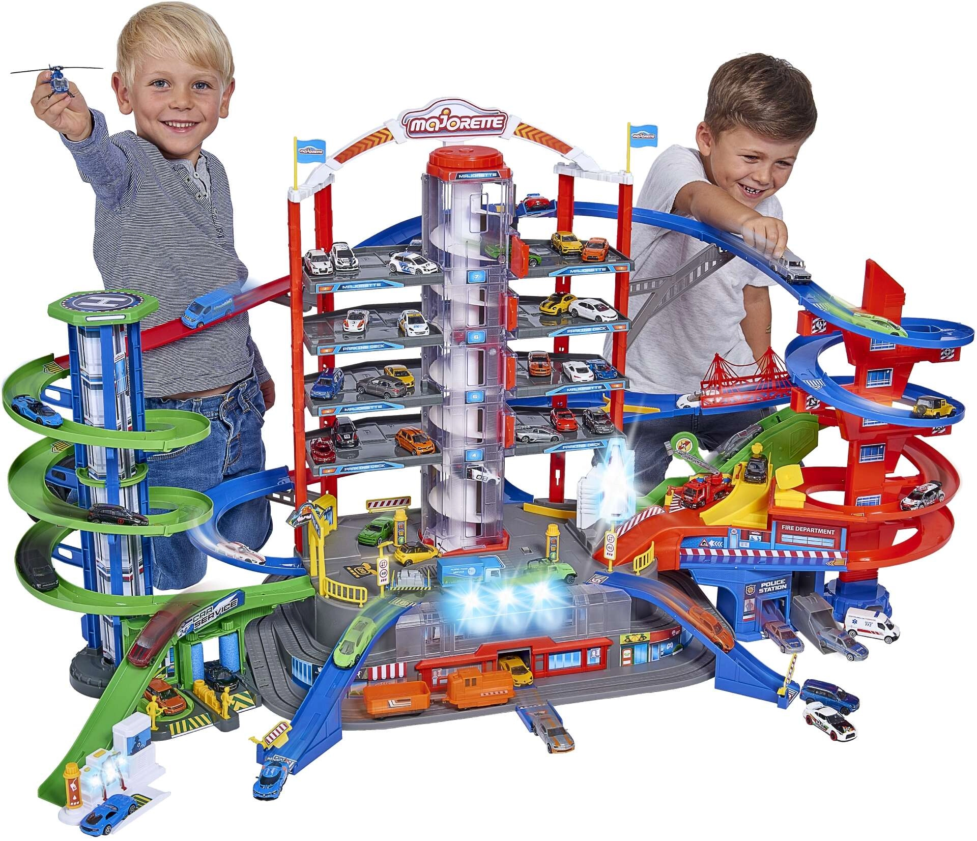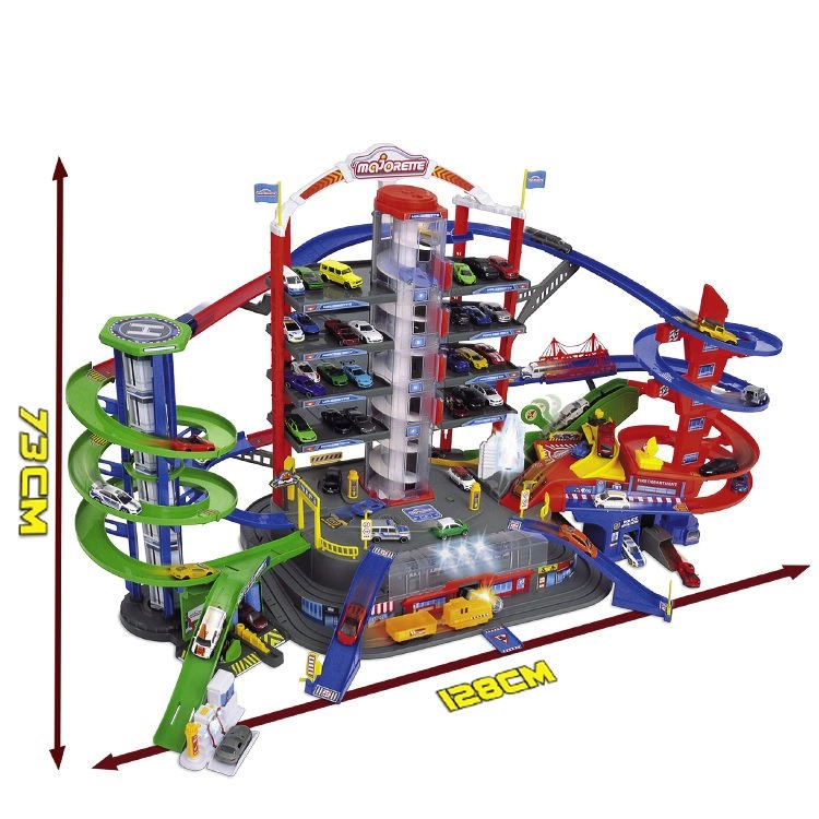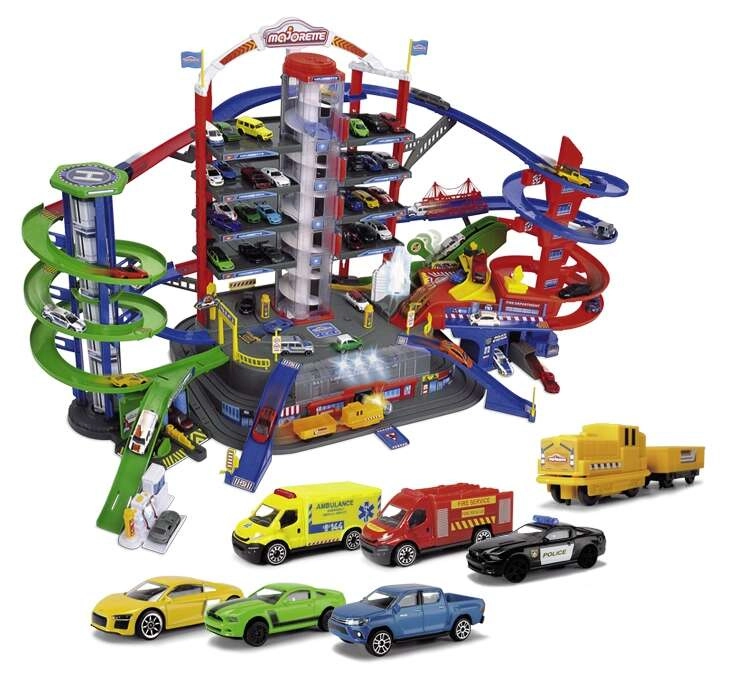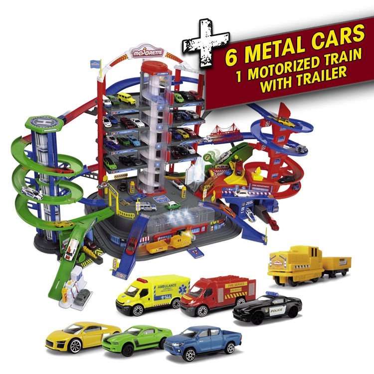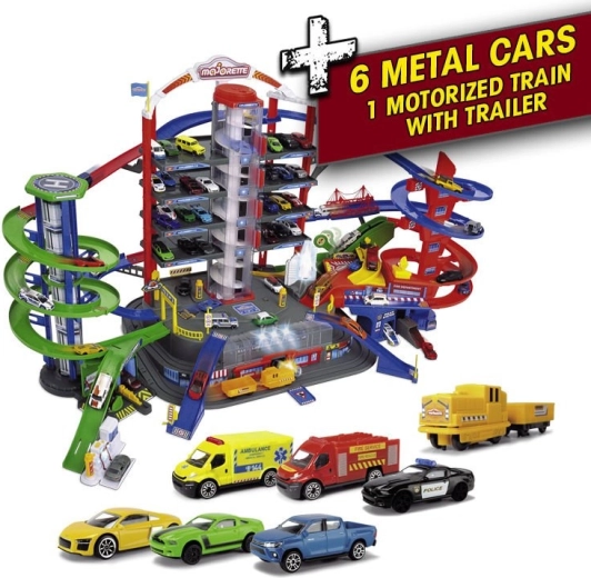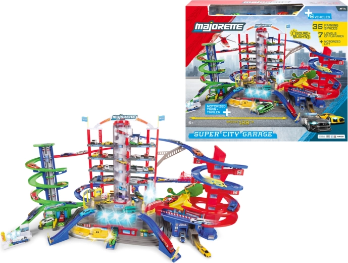 Descoperă mega-setul pentru micii șoferi: complexul de garaj Super City pe 7 etaje cu lift, rampe spiralate și 6 mașinuțe metalice completate de o locomotivă cu efecte de lumină și sunet. Nu lipsesc heliportul, stația de poliție și pompieri, spălătoria și stația de alimentare cu sunete și lumini – totul pentru ore întregi de joacă creativă și plină de acțiune.