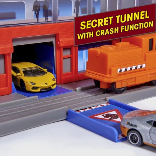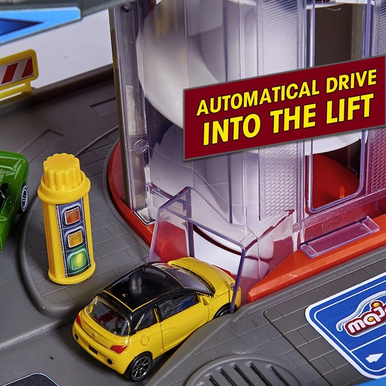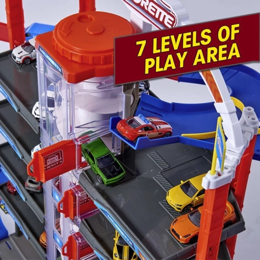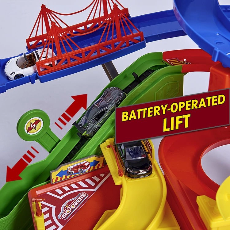 Acest set mare de garaj oferă copiilor posibilități nesfârșite de joc pe cele șapte etaje. Pistele spiralate colorate, liftul acționat pe baterii și efectele luminoase și sonore realiste îi vor captiva pe toți pasionații de mașini și trenuri. Mașinuțele metalice cu roți care se rotesc liber rulează lin pe rampe, în timp ce locomotiva cu vagon trece printr-un tunel secret și oprește la stația feroviară.