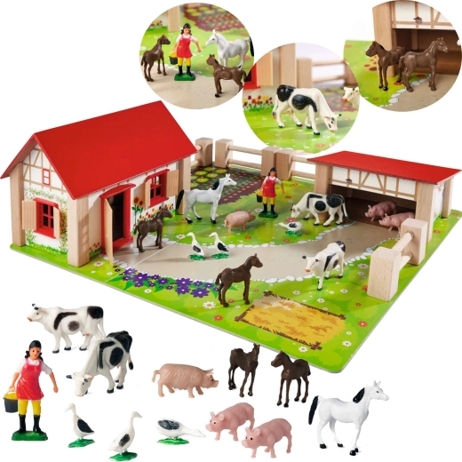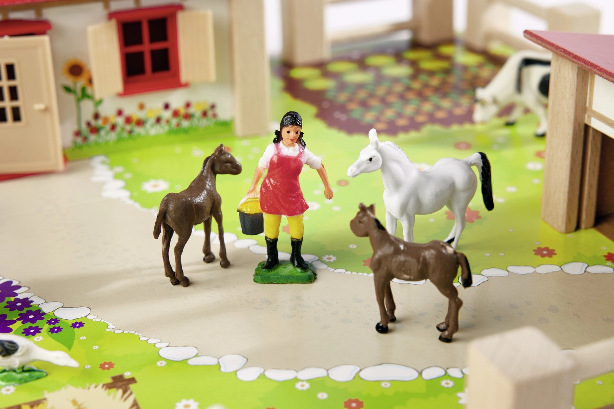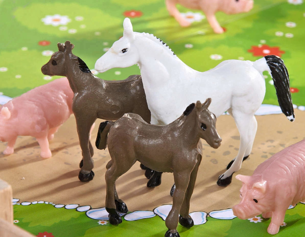 Cai, vaci, purceluși, gâște și îngrijitoarea stimulează imaginația, îi învață pe copii să recunoască speciile de animale și dezvoltă abilitățile sociale prin joc de rol.