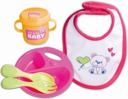 Farfurie, linguriță, furculiță, cană cu toarte și bavețică textilă – totul într-un singur pachet pentru hrănirea realistă a păpușii.