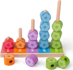 Jocul din lemn cu floricele colorate de înșirat BIGJIGS este o jucărie educativă ideală pentru primele învățări. Prin joc, copiii descoperă în mod natural culorile, sortează formele și exersează număratul, în timp ce își dezvoltă motricitatea fină. Construcția robustă din lemn și marginile netede garantează o utilizare sigură și de durată.