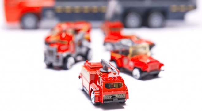 Jucăria include mașinuțe din metal care imită fidel vehiculele reale de pompieri cu detalii precise.