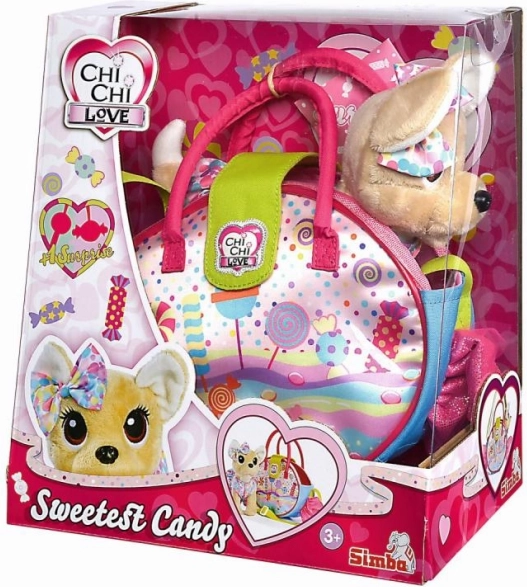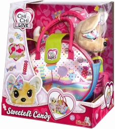 Designul inspirat de dulciuri este completat de brelocuri în formă de bomboane, care oferă poșetei un stil personal. Cățelușul este moale, catifelat și sigur pentru îmbrățișat, așa că cei mici îl vor îndrăgi rapid. Joaca cu cățelușul încurajează responsabilitatea și grija în situațiile de zi cu zi.