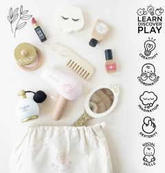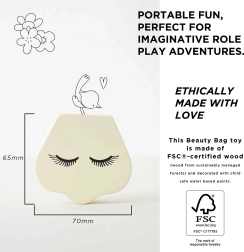 Devino vedeta propriului spectacol cu această geantă cosmetică stilată pentru copii! Conține tot ce ai nevoie pentru jocul de machiaj – de la cremă la uscător de păr. Realizată din bumbac natural și lemn de înaltă calitate certificat FSC®, pictată manual cu vopsele ecologice. Susține imaginația, motricitatea fină și jocul de rol.
