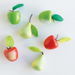 - 6 bucăți de fructe (2 mere roșii, 2 mere verzi, 2 pere verzi) + 1 ladă din lemn
