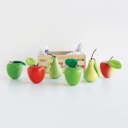 Lada din lemn cu mere și pere din colecția HONEYBAKE aduce copiilor un joc realist de-a magazinul, piața fermierilor sau bucătăria. Fiecare bucată de fruct are codiță din fetru și frunză brodată pentru un aspect autentic. Lada are mânere practice pentru transport facil.