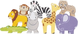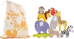 Acest set jucăuș aduce o parte din sălbăticie în camera copilului. Cei mici pot construi cel mai înalt turn din animăluțe – girafă, leu, elefant, zebră, maimuță, rinocer, ghepard, crocodil și papagal – exersând echilibrul, răbdarea și imaginația. Jocul de echilibrare dezvoltă gândirea logică și sprijină percepția formelor și a culorilor.