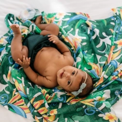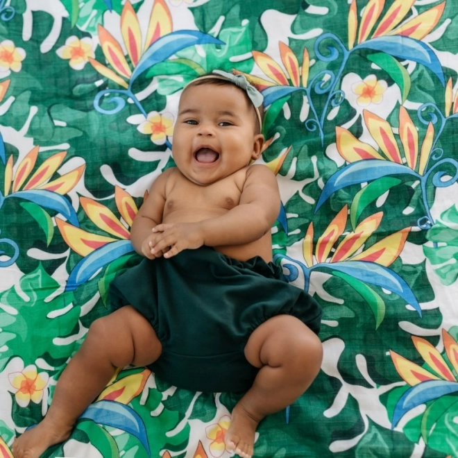 Dimensiunea generoasă de 120 × 120 cm permite utilizare universală acasă și în deplasare. Designul stilat Lush Garden atrage privirea de la prima vedere și completează modern trusoul bebelușului.