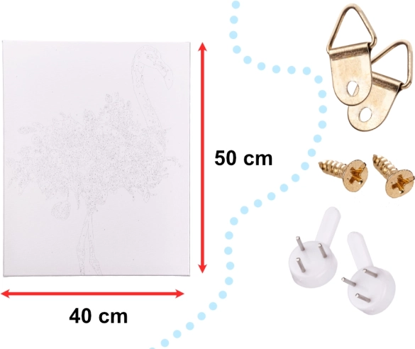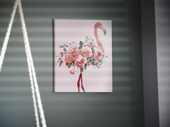 - Kit complet ce include un șasiu de lemn cu pânză imprimată cu model de flamingo.
