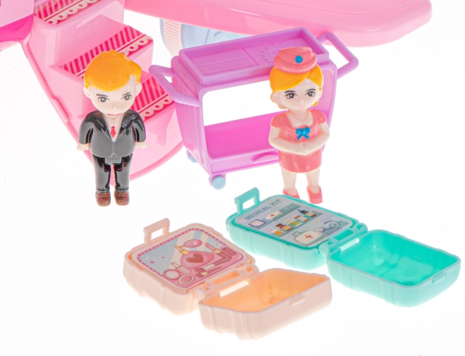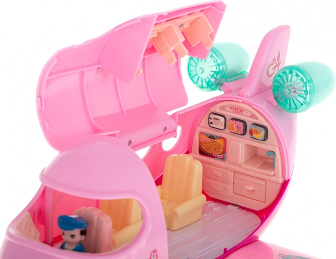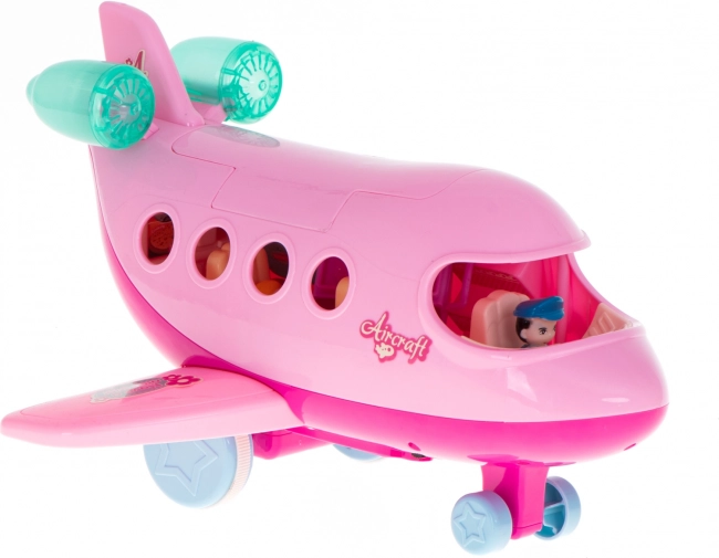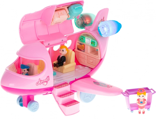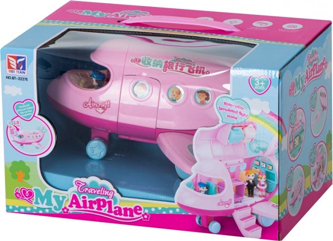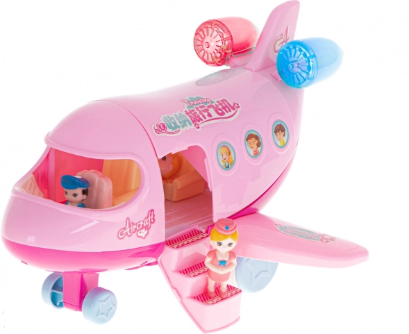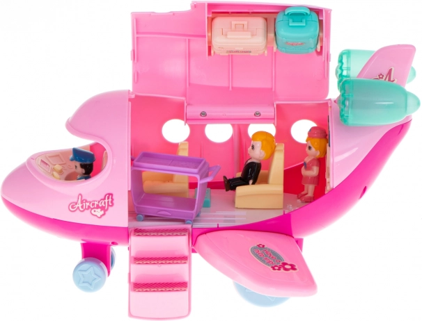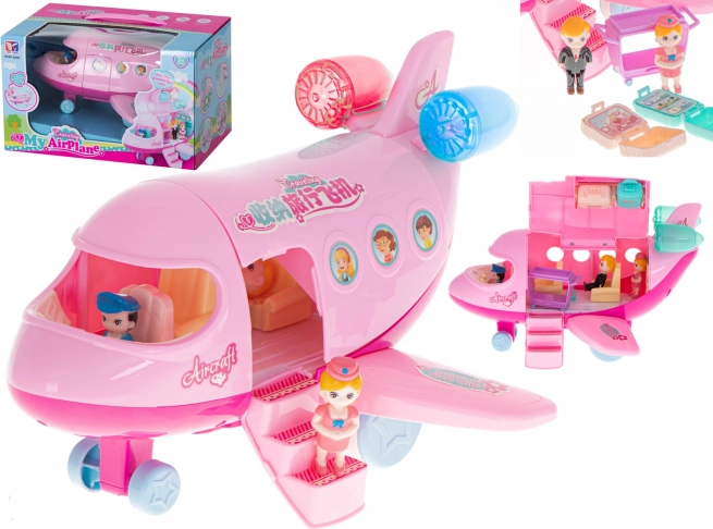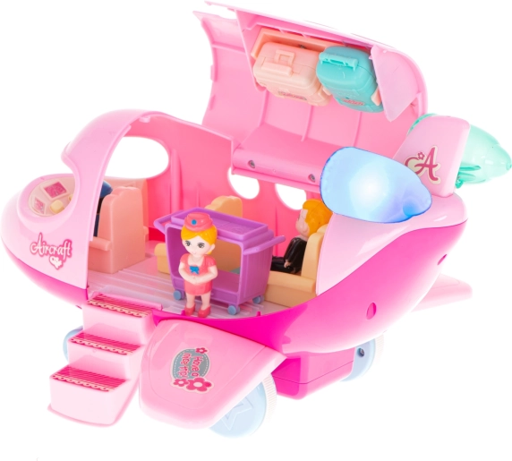 La apăsarea butoanelor, emite sunetele cunoscute de pe un aeroport real, incluzând aterizarea. Se aprinde cu LED-uri colorate. Avionul mai cântă și o melodie. Are roți mobile. În avion așteaptă un pilot pentru pasageri. Va lua la bord un călător elegant și o stewardesă. În timpul zborului, pe lângă priveliștile uimitoare din fereastră, este asigurat un serviciu de gustări, care va fi livrat pe un cărucior special. Fără bagaje nu poți călători, astfel încât setul include două valize deschizabile cu mânere detașabile.