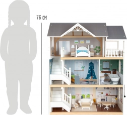 Căsuța pentru păpuși are o fațadă exterioară luminoasă, design modern și elemente funcționale precum uși glisante și ferestre care se deschid.