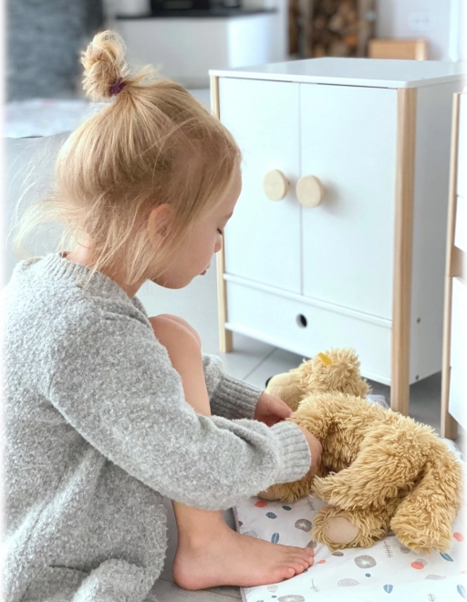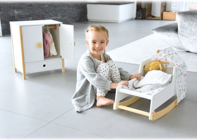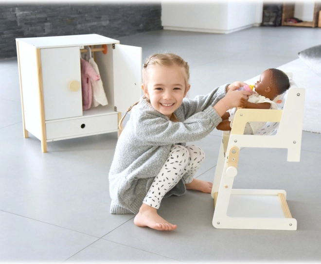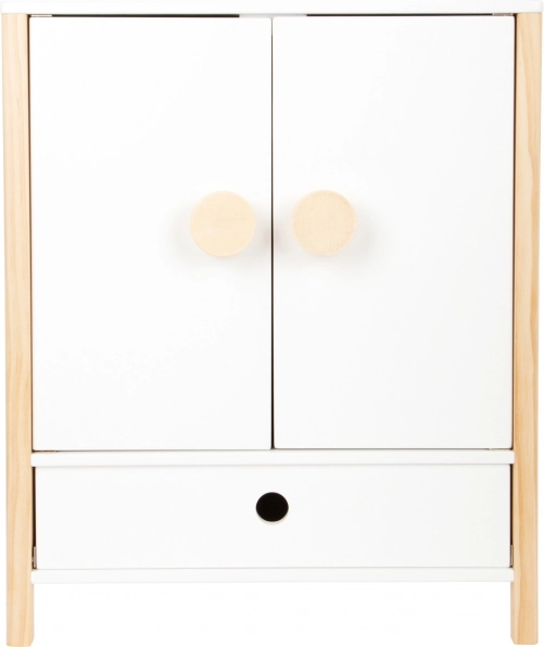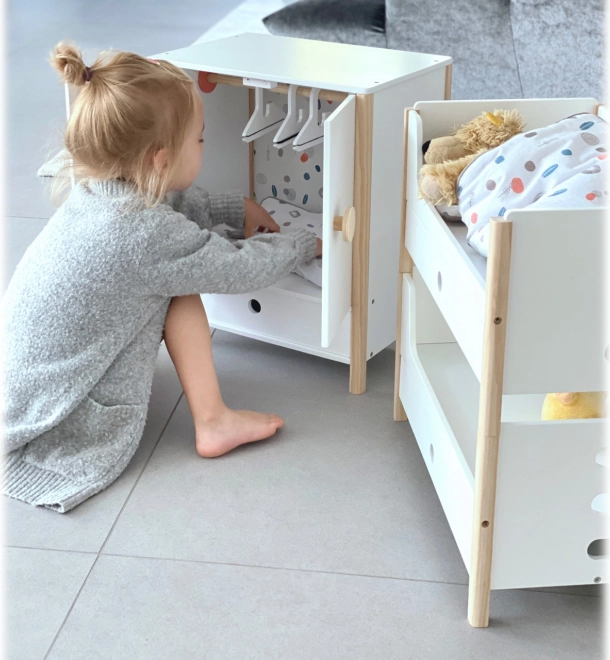 Construcția durabilă din lemn, realizarea stabilă și muchiile rotunjite asigură un joc confortabil și sigur. Dulăpiorul sprijină autonomia, simțul ordinii și dezvoltă imaginația în jocurile de îngrijire a păpușilor.
