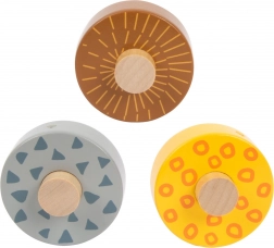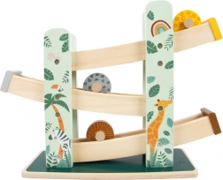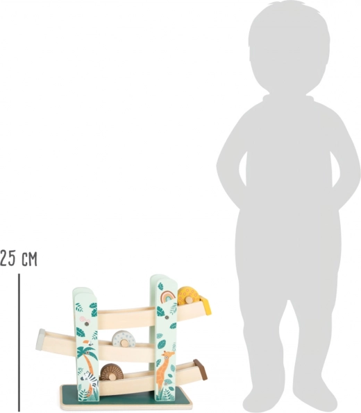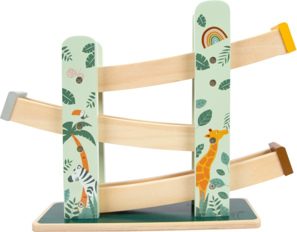 Această frumoasă pistă din lemn oferă copiilor oportunitatea de a urmări cum cele trei roți, fiecare cu un design unic, coboară pe cele trei rampe. Este decorată cu ilustrații de animale care trăiesc pe safari și plante din junglă.