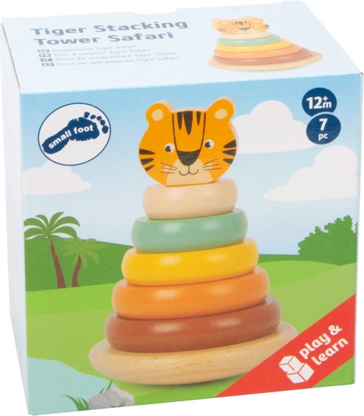 Aceast impresionant turn de inserare cu motiv de tigru este nu numai o jucărie frumoasă, dar și un instrument excelent pentru dezvoltarea abilităților copiilor. Este compus din 7 piese, inclusiv o bază și șase inele colorate, care pot fi așezate pe un suport încheiat cu un cap de tigru. În acest fel, copiii exersează coordonarea mâini-ochi și înțelegerea formelor.