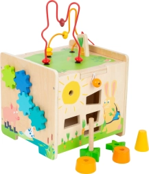 Acest cub motric din lemn de înaltă calitate, cu motive ale iepurașului și prietenilor săi, îi motivează pe copii să exploreze, antrenează coordonarea mână–ochi și susține primele percepții muzicale datorită xilofonului integrat. Partea superioară cu labirintul de mărgele se detașează și se poate întoarce pentru a economisi spațiu, iar cubul poate fi folosit practic ca scăunel.