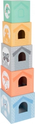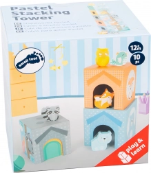 Turnul de stivuire „Pastel” combină cuburi solide din carton cu animăluțe din lemn, într-un design modern pastelat. Fiecare latură a cuburilor oferă indicii pentru ordinea corectă, astfel încât copiii învață prin joc sortarea și percepția spațială. Datorită ferestrelor și ușițelor, animăluțele pot „locui” în interior, stimulând imaginația și jocul de rol.