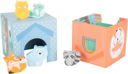 Cuburile pot fi ridicate într-un turn înalt sau introduse unul în altul. Ferestruicile și ușițele invită la jocuri de-a v-ați ascunselea cu animăluțele și dezvoltă imaginația și motricitatea fină.