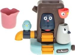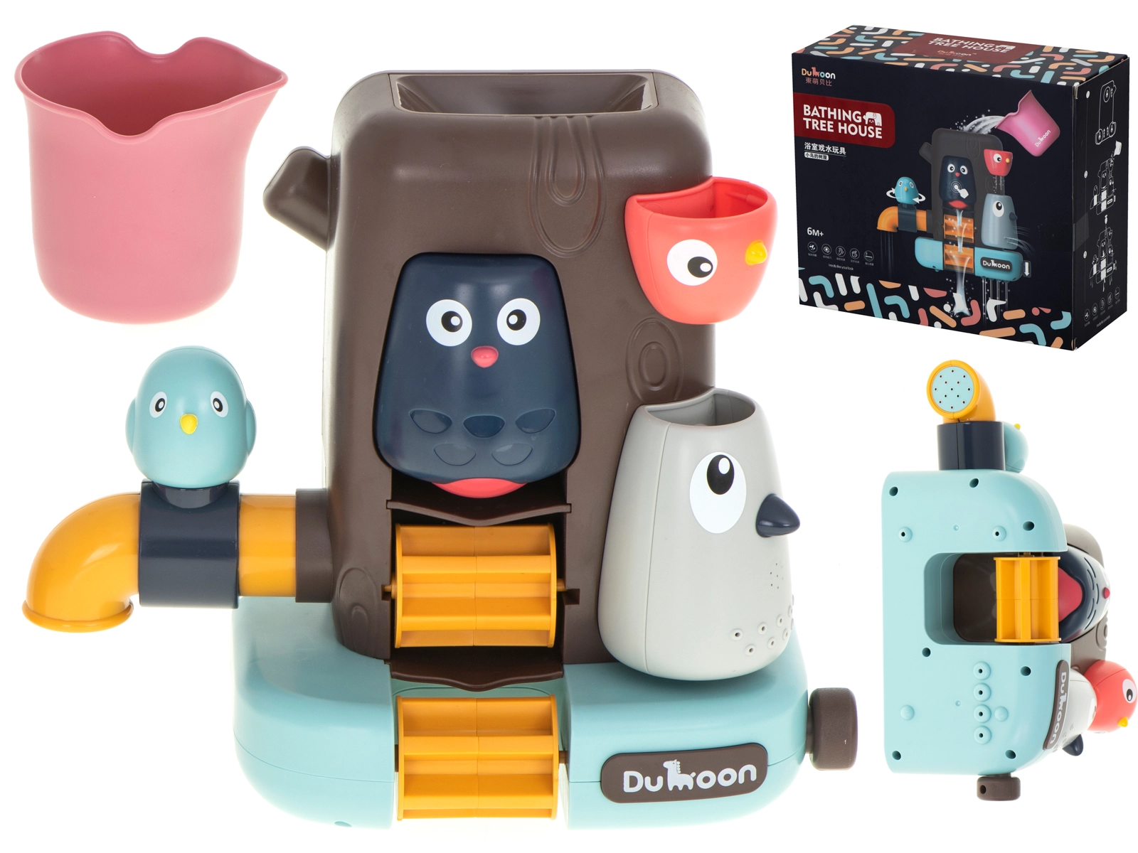 Transformă baia zilnică într-o aventură! Această căsuță colorată în copac, cu păsărele și un robinet funcțional, se fixează pe cadă cu ajutorul ventuzelor și oferă numeroase activități cu apă. Copiii toarnă apă din cănuță și privesc cum se învârte rotița, curge apa din robinet și din păsărică iese o stropire fină ca o dușcă. Excelentă pentru dezvoltarea motricității fine, a gândirii logice și a creativității.