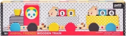 Acest trenuleț modern din lemn are o locomotivă și două vagoane, patru cuburi cu cifre și două animăluțe drăgălașe. Copiii îl pot trage de șnur, pot construi și rearanja cuburile și figurinele, dezvoltându-și imaginația, logica și atât motricitatea fină, cât și pe cea grosieră.