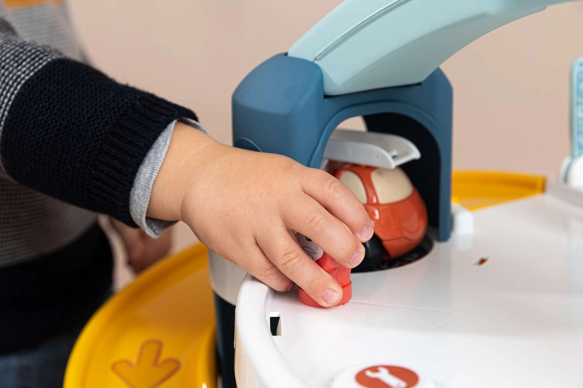 Copiii trimit cu entuziasm mașinuțele pe rampa lungă în spirală prin toate cele trei etaje, exersând coordonarea și motricitatea fină.
