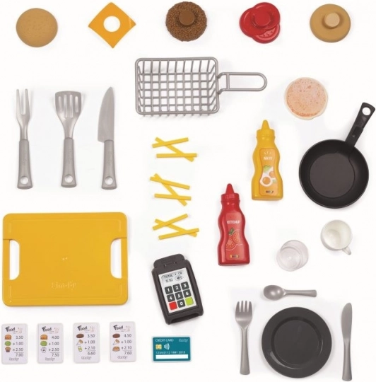 Setul impresionează prin multitudinea de detalii: plită, friteuză, chiuvetă cu robinet, cuptor, frigider, dozator de băuturi, aparat de cafea și cârlige suspendate pentru ustensile. Nu lipsesc terminalul de plată, bonurile, cardul de credit și meniul tipărit. După joacă, resturile pot fi „aruncate” la coș. În total, 29 de accesorii susțin scenarii bogate de joc de rol și dezvoltarea motricității fine.