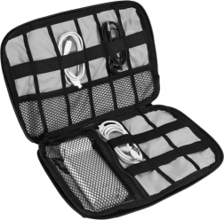 Acest organizator de călătorie gri este o soluție excelentă pentru oricine dorește să aibă accesoriile electronice mereu la îndemână și perfect ordonate. Este fabricat din poliester rezistent, oferă compartimente gândite inteligent, benzi elastice și buzunare din plasă pentru depozitarea în siguranță a cablurilor, încărcătoarelor, power bank-urilor, stick-urilor USB sau cardurilor de memorie. Închiderea cu fermoar de calitate protejează conținutul în timpul transportului.