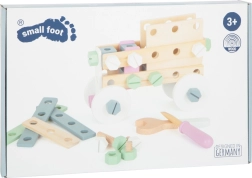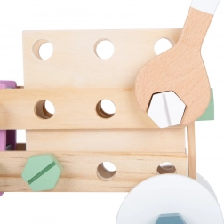 Această trusă de construcție din lemn de calitate, în stil nordic, îi transformă pe micii constructori în adevărați ingineri. Cu ajutorul cheii și al șurubelniței, copiii își asamblează singuri diverse modele – de la vehicule la structuri simple – și le pot demonta la fel de ușor. Fibra vizibilă a lemnului, combinată cu culorile pastel, stimulează simțurile și face jocul plăcut și sigur.