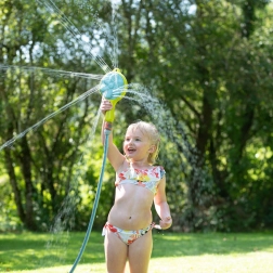 Copiii adoră să petreacă timpul în aer liber, iar acest aspersor de apă pentru grădină le va oferi ore de distracție. Poate fi așezat liber pe sol, ținut în mână sau atașat la o căsuță de grădină. Aspersorul oferă două moduri de pulverizare a apei - constant și rotativ, care pot fi schimbate printr-un buton special.