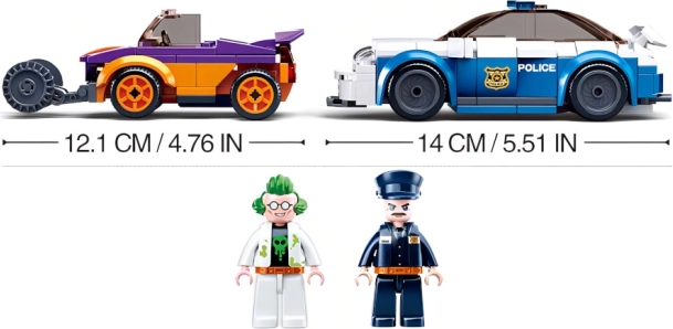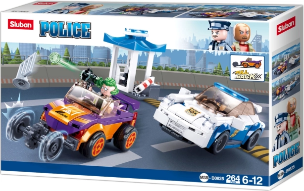 Setul include două vehicule - o mașină de poliție alb-albastră și o mașină colorată originală, ambele având mecanism de tragere. Fiecare mașină are detalii, design și dimensiuni unice, permițând nenumărate scenarii de joc.