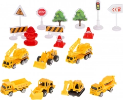 Setul include excavator, betonieră, buldozer, autobasculantă, macara și alte vehicule, completate de indicatoare, conuri și copăcei pentru a crea propriile șantiere.