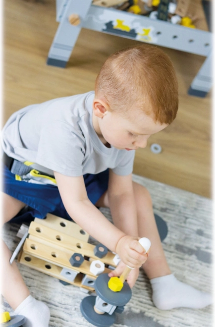 Pachetul include accesorii bogate: lamele și plăci de construcție cu orificii pre-găurite, cuburi, roți, adaptoare pentru roți, distanțiere și două unelte din lemn – cheie și șurubelniță. Totul se păstrează ordonat în cutia practică, astfel încât nicio piesă să nu se piardă.