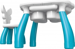 Masa nu servește doar pentru construirea cu blocuri, ci și ca suprafață pentru scris și desen.