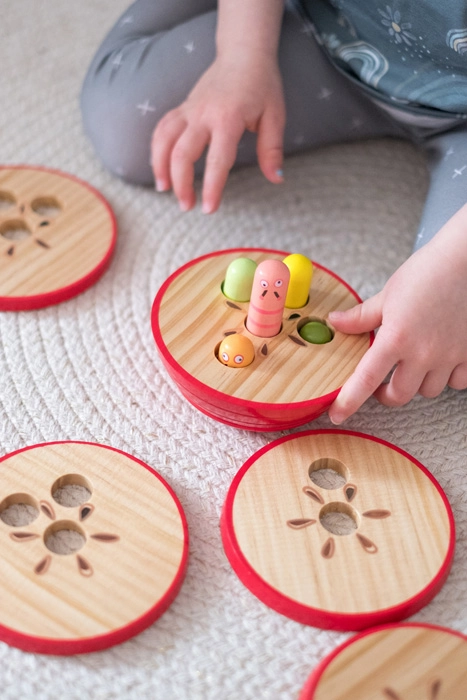 Acest puzzle ingenios îi invită pe copii să așeze straturile astfel încât numărul orificiilor din strat să corespundă numărului de viermișori vizibili din suport. Fiecare viermișor are altă înălțime, astfel încât copiii exersează în mod natural logica, răbdarea și diferențierea formelor și mărimilor.