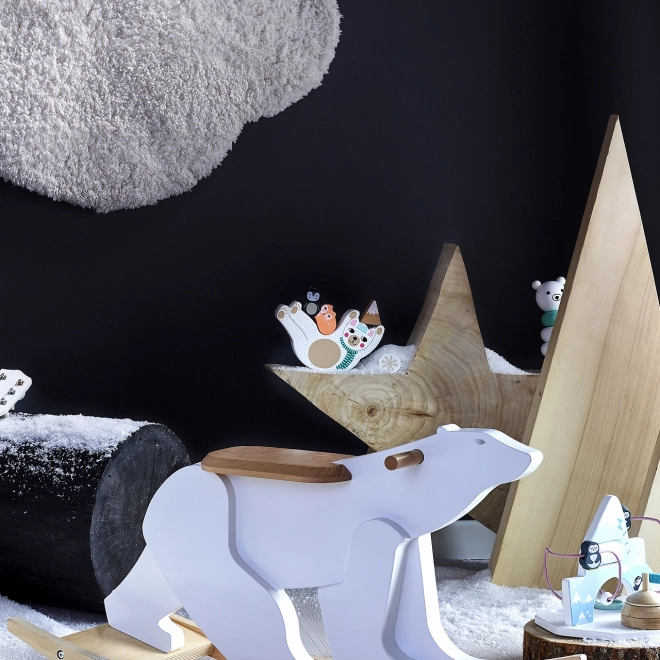 Copiii suprapun animăluțe, fulgi și forme pe ursulețul legănat și învață să echilibreze cu grijă fiecare piesă.
