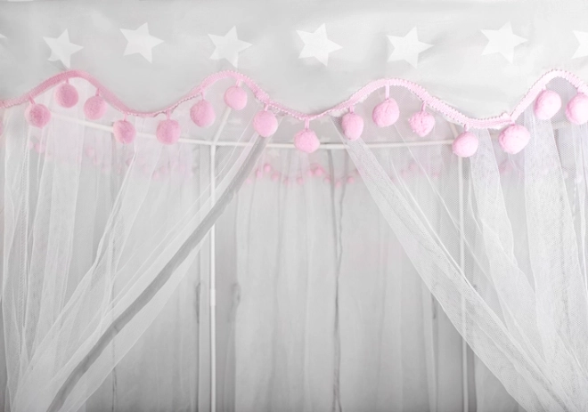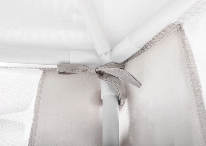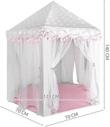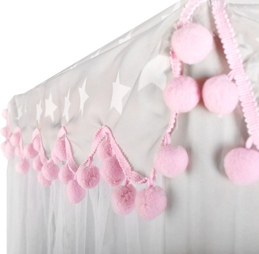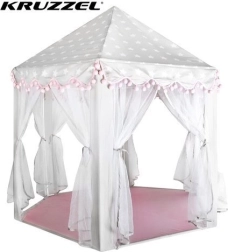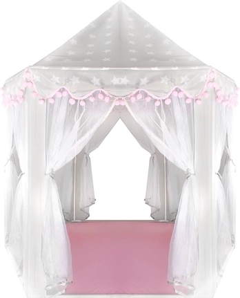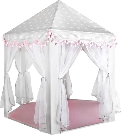 Salteaua spațioasă și lateralele aerisite asigură confort pentru unul sau mai mulți copii – încap o mulțime de pernuțe, plușuri și cărți. Cortul este perfect pentru interior și pentru grădină sub supravegherea adulților. Pompoanele decorative și posibilitatea de legare a draperiilor cu funde oferă jocului stil și intimitate.