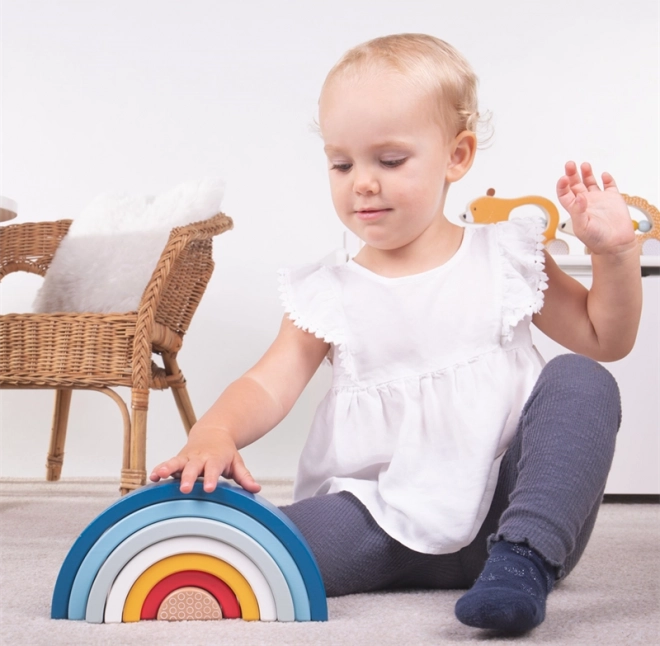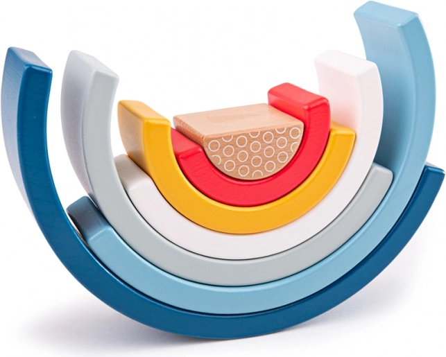 Curcubeul din lemn în culori vii oferă copiilor posibilități nesfârșite de construcție – de la poduri și tuneluri până la creații imaginative. Fiecare arcadă se potrivește precis în cealaltă, ceea ce susține coordonarea mână–ochi și îi învață pe copii să distingă mărimile și formele.