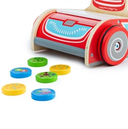 Magnetul ascuns pe partea inferioară a aspiratorului prinde discurile colorate din lemn, oferind copiilor feedback imediat și un joc care chiar funcționează.