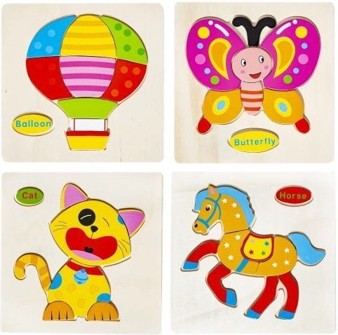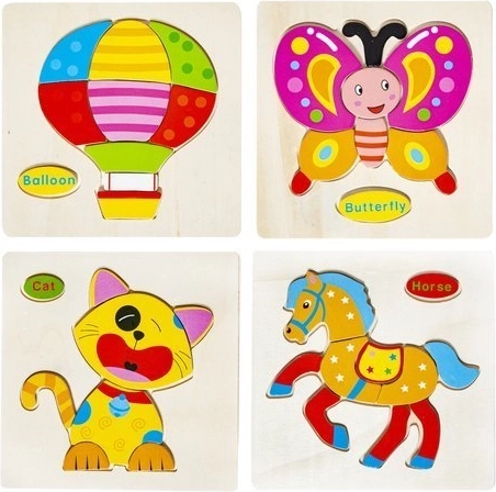 - Setul conține 4 puzzle-uri: pisică, cal, fluture și balon