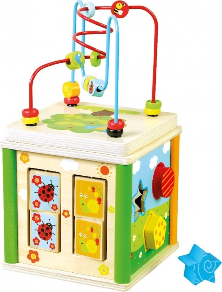 Datorită activităților diverse, copiii își exersează într-un mod jucăuș raționamentul logic, concentrarea și creativitatea. Cubul este realizat din lemn rezistent și completat cu elemente din metal, astfel încât face față explorării zilnice a celor mici.