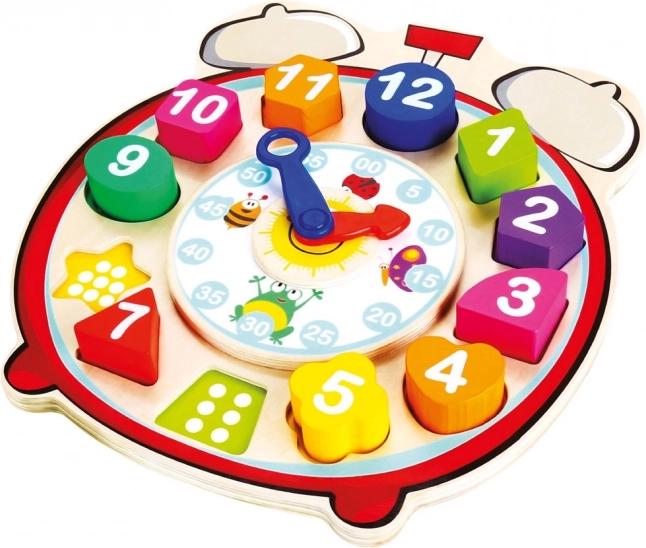Această jucărie educativă multifuncțională din lemn îmbină un puzzle cu un ceas. Piesele colorate de forme diferite, cu cifre, se introduc în orificiile corespunzătoare, iar sub piese sunt marcate puncte pentru orientare mai ușoară și primele numărări. Acul pentru ore și cel pentru minute, ambele rotative, îi ajută pe copii să înțeleagă principiul măsurării timpului într-un mod distractiv și intuitiv.