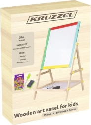 Această tablă dublă KRUZZEL oferă două suprafețe pentru desen și scris: pentru cretă și whiteboard (ștergere la uscat). O simplă rotire și șuruburile fluture permit schimbarea rapidă a feței. Rama din lemn cu elemente colorate este solidă, netedă și sigură pentru copii.