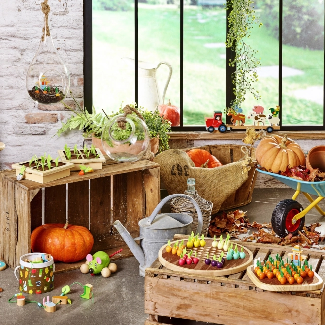 Suportul din lemn masiv și morcovii din lemn și pâslă asigură durabilitate și un aspect natural plăcut, care îi atrage pe copii la joacă.