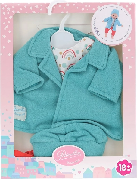 Ținută stilată pentru păpușă de 36 cm de la Petitcollin în designul Arthur: hanorac din fleece turcoaz, bluză cu model, pantaloni scurți roșii și căciuliță. Execuție de calitate, eleganță franțuzească și culori vii susțin imaginația și bucuria jocului, în timp ce îmbrăcarea ușoară este la îndemâna mânuțelor mici.