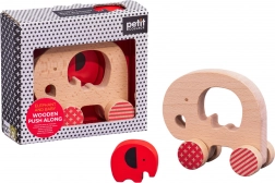 Puiul de elefant roșu, detașabil, se introduce în deschiderea din mijlocul elefantului. Copiii își exersează prinderea, logica și coordonarea în timp ce îl trag pe roți.
