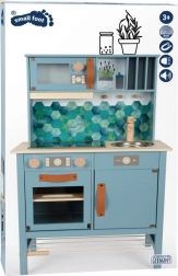 Această bucătărie de lemn oferă copiilor un spațiu excelenț pentru joc imaginar. Este echipată cu o plită electronică cu efecte de lumină și sunet și hotă retractabilă cu simbol luminos. Butoanele rotative emit sunete autentice pentru o experiență cât mai reală. Tava detașabilă poate fi folosită ca o tablă, adăugând versatilitate jocului.