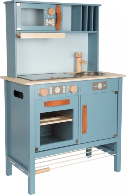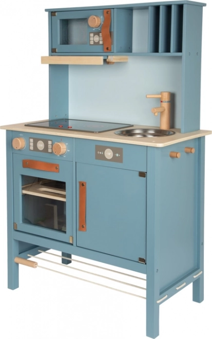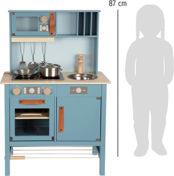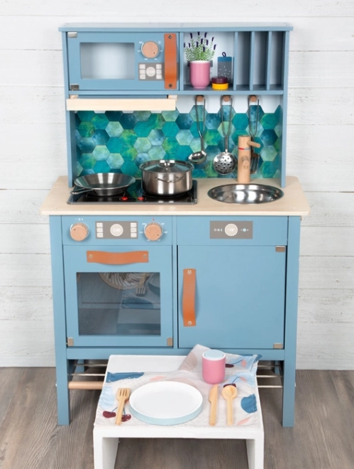 Bucătăria de copii în nuanța albastru fumuriu, cu mânere din piele stilate, oferă un sentiment realist de gătit.