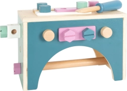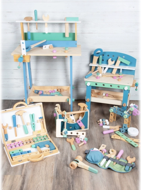 Aceast3 cutie de lemn cu unelte este ideal3 pentru copii care doresc s3 imite repara3iile reale și me3tr3s3ria. Design nordic simplist în nuan3țe pastelate, se potrivește perfect în orice camer3 de copil: